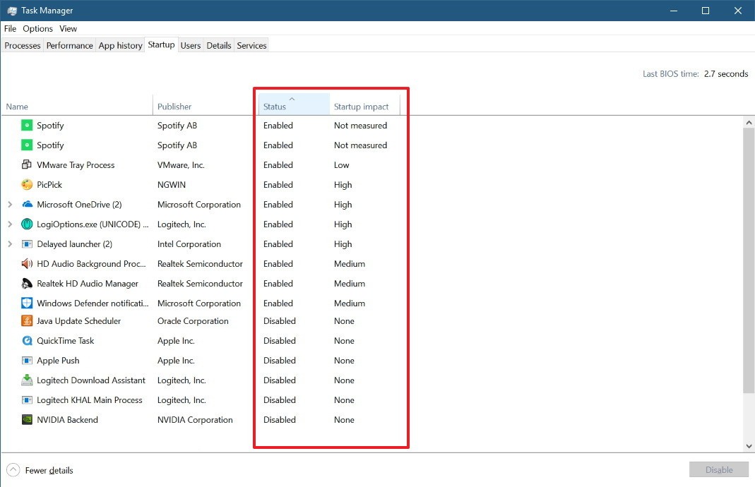Once you reach the task manager you will notice two important columns that are the ‘Status’ column and the ‘Startup impact’ column. These two columns enable you to check which app launches on startup and how much of an impact does it have on the computer performance-wise.