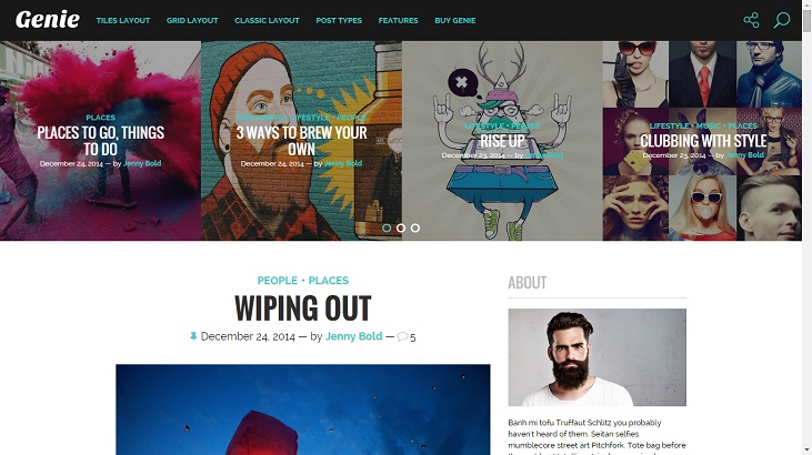 Genie is pretty much the same as Boroda, but where it stands out is its beautiful thumbnail row on the top, which showcases articles in a dazzling way. Scroll down and you’ll find the normal blogging style. It is a simple personal blogging theme with distinctive typography and clean layout.