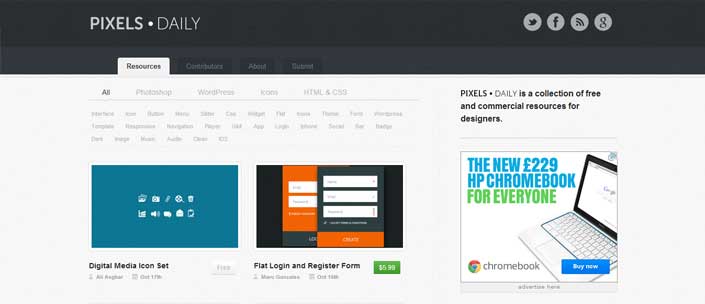 Pixels Daily is an online resource for free and commercial resources for designers which includes font’s, pre-designed layouts, icon sets, wireframing sets and much more explore for more things.