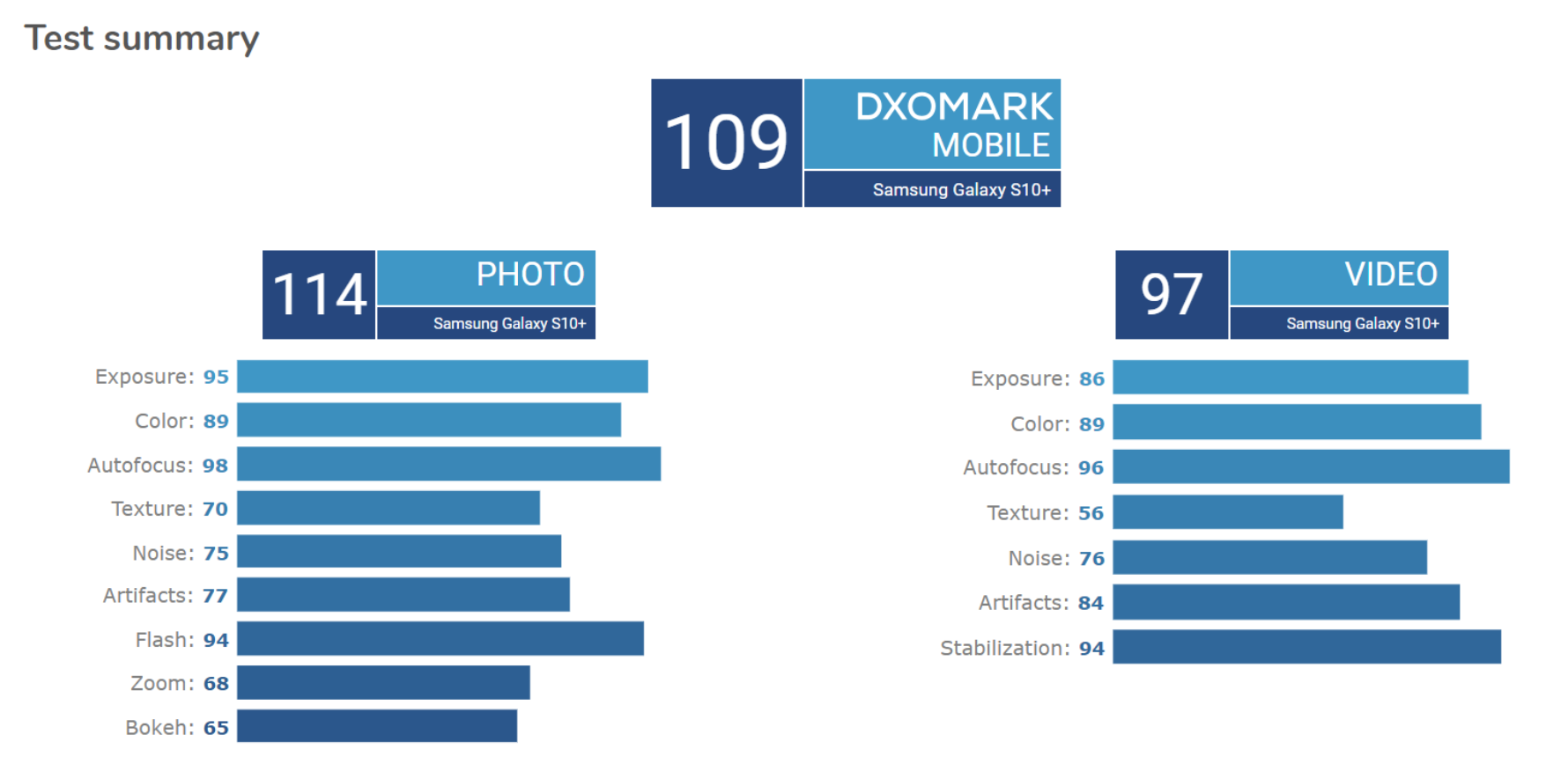 “With an overall DxOMark Mobile score of 109 points, the Samsung Galaxy S10+ joins the Huawei Mate 20 Pro and P20 Pro at the very top of our smartphone camera ranking. Samsung’s outstanding overall score builds on a Photo score of 114 points, with the camera doing especially well in the exposure, color, and bokeh categories.”