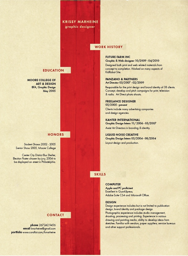 7. She is an experienced web designer. Her resume is creative, yet simple and should be a six second treat for anyone viewing it. She also includes a link to her portfolio and includes all her details. It not only shows her credentials, but also her abilities as a designer.