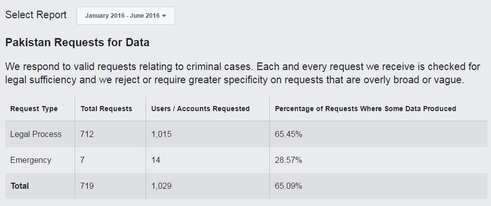 Facebook published a report from January 2016 to June 2016, with statistics of all countries including Pakistan. Pakistan Government made a total of 719 requests which shows a huge upswing as compared to same time last year when only 192 requests were made.