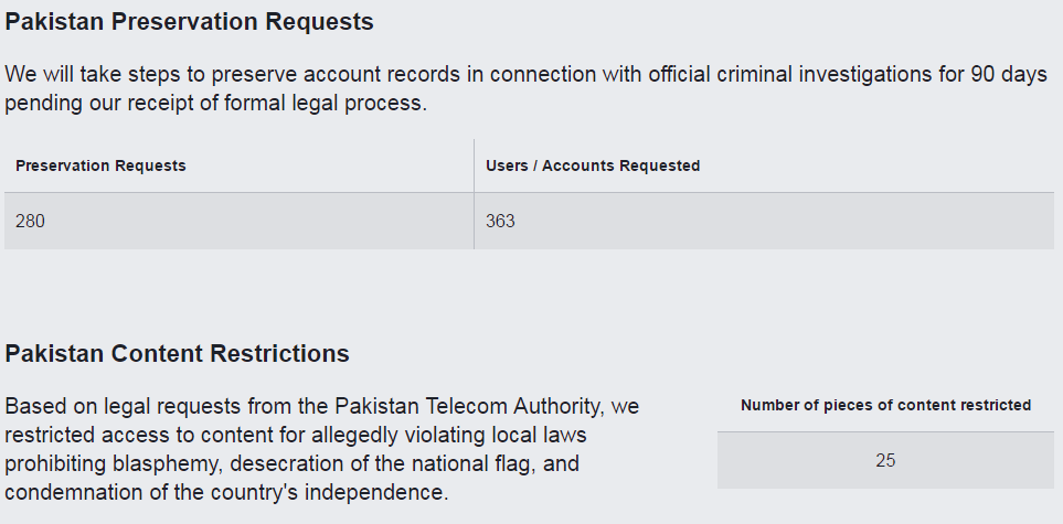 “Based on legal requests from the Pakistan Telecom Authority, we restricted access to content for allegedly violating local laws prohibiting blasphemy, desecration of the national flag, and condemnation of the country’s independence.”