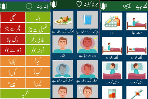 The app uses the recorded voices of a man and a woman that can communicate different real-life scenarios to other people and help them explain their current situation to others. For instance, if they are having pain or are hungry they can tap on the buttons and the mobile speaker will say the thing. All app is in Urdu and it is effortless to use, no login or other information is required, and the app is ready to use just as you download it.