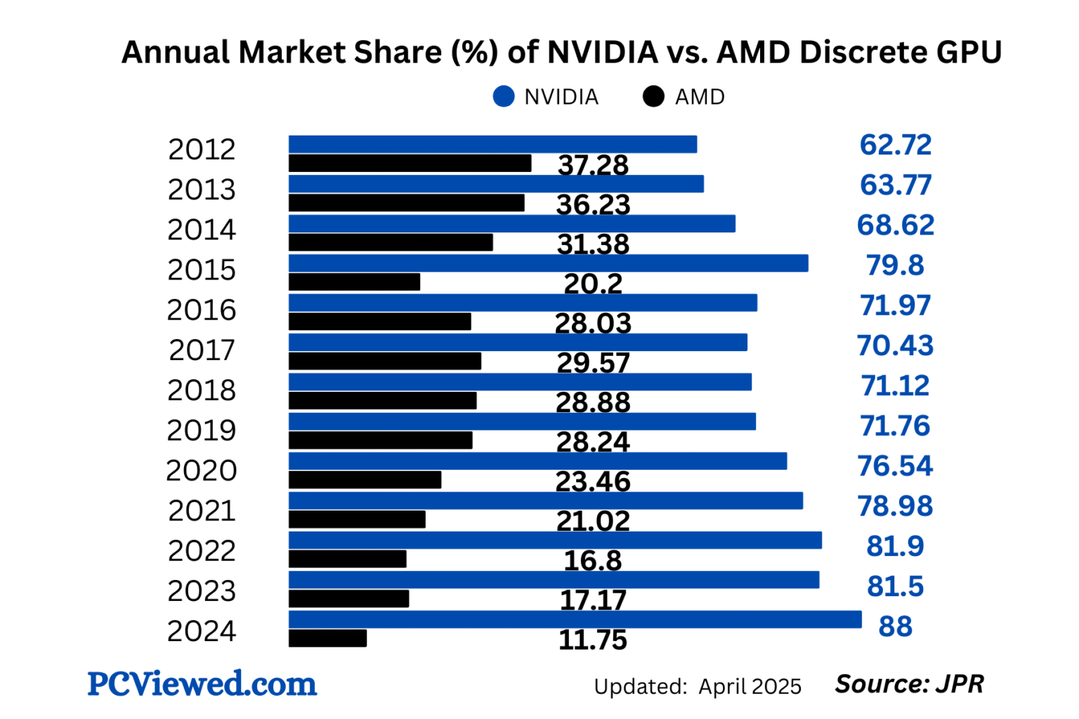 Industry data reports that NVIDIA now holds about 94% of the discrete GPU market, while AMD’s market share has plummeted to around 6%.