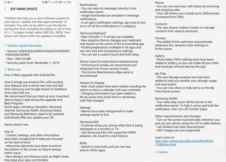 This update brings Samsung’s take on Android 9 Pie’s new interface. The total download size of the update is around 1.8GB. You can view the entire changelog below: