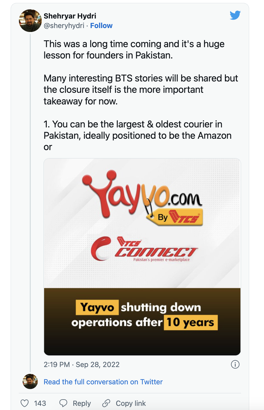 Shehryar Hydri, a partner at Deosai Ventures, remarked on the news, calling Yayvo’s closure “long overdue” and “a lesson for Pakistani innovators.”