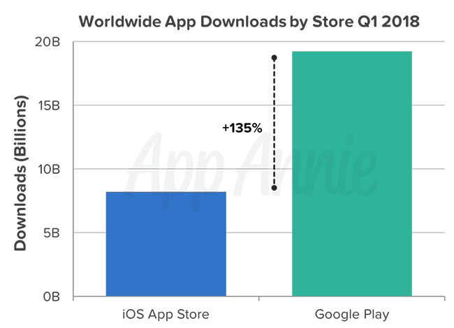 The first quarter Q1 2018 is record-breaking in terms of downloads on Google Play Store and iOS. iOS downloads exceeded 8.2 billion and Google Play downloads exceeded 19.2 billion, respectively. The thing to notice here is that quarter over quarter, Apple’s iOS has narrowed the global downloads gap with Google Play Store by 10%.