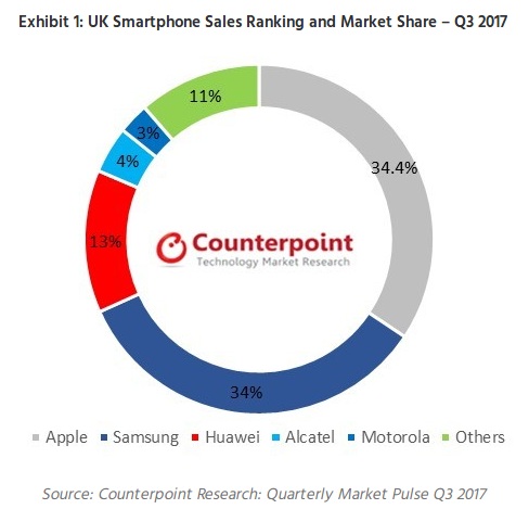 Apple has been a top smartphones brand in terms of sale in the UK for quite a while, and it has topped again in the country in third quarter of the year 2017, with 34.4% sales. Samsung followed closely with a 34% sales in Q3, while Huawei has been successful in holding the third spot with 13% market share.