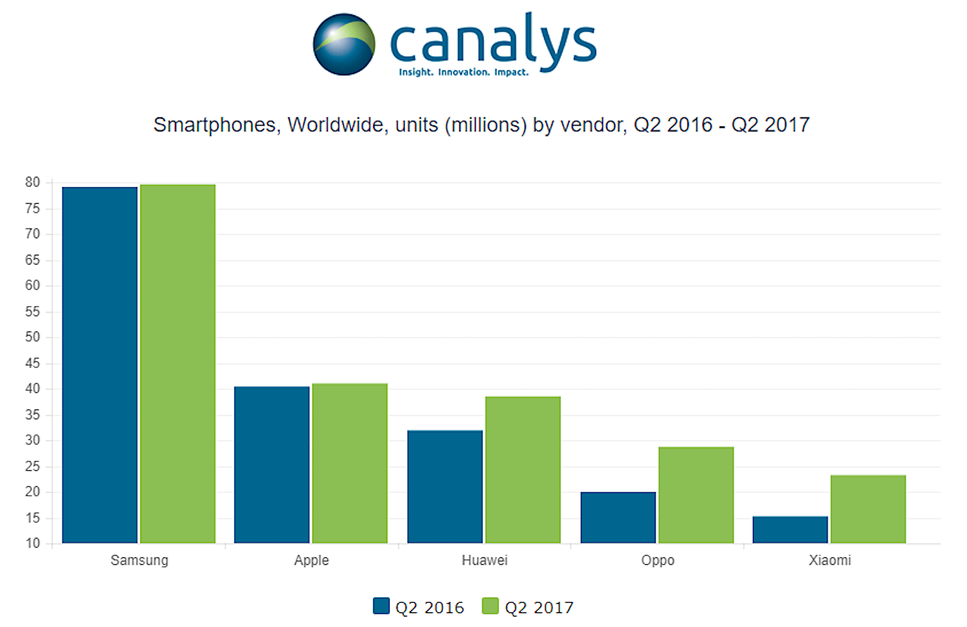 The latest set of statistics come from a Singapore-based research firm, canalys. The company states that Apple was able to witness a slight increase of 2% in the second quarter of 2017 as compared to Huawei which saw a mighty 20% surge in smartphone sales. Huawei was able to sell a whopping 38 million devices which are quite close to 41 million as sold by Apple.