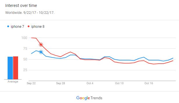 While comparing iPhone 7 and iPhone 8 via Google trends you can easily observe the minimal difference of search of these devices. The older model is still beating out the newer version.