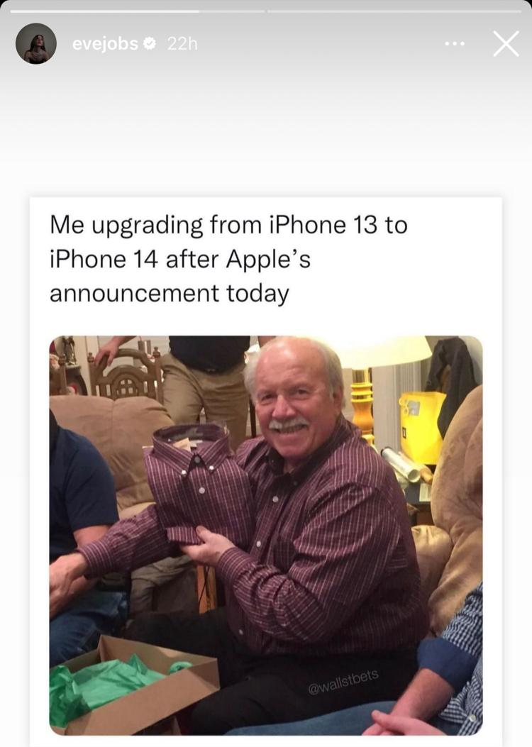 “Me upgrading from iPhone 13 to iPhone 14 after Apple’s announcement today,” while showing a man holding up a shirt identical to the one he’s wearing.