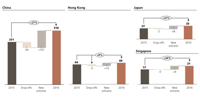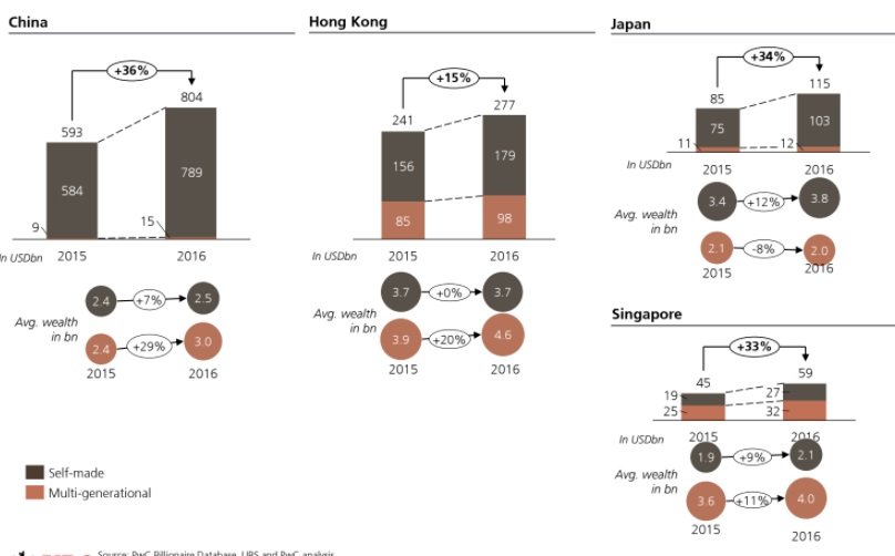 Unsurprisingly, China led the growth in Asia’s billionaire count with 27% increase in the number of billionaires. China has 318 billionaires right now. Singapore saw a 24% increase with 21 billionaires, Hong Kong now has 69 billionaires with 8% increase and Japan registered a growth of 22% with 33 billionaires.