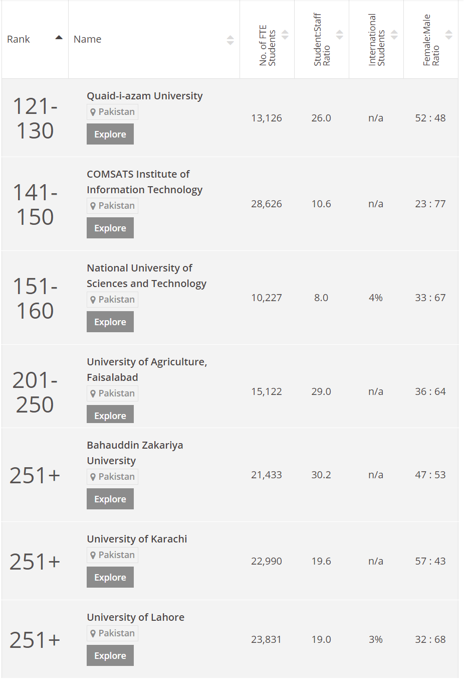 The Times Higher Education list of the latest Asia University Rankings 2017 includes seven Pakistani institutions in the top 300, up from only two institutions in 2016.