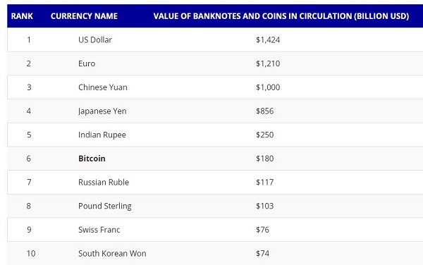 The world’s most dominating cryptocurrency, Bitcoin is now also the sixth largest currency in the world in terms of circulation, with a total value of $180 billion. According to the stats of Bank for International Settlements, Bitcoin has outranked Pound, Ruble, and Won, and is behind the five superpowers, while US Dollar sits on top with $1,424 billion of total value by circulation.