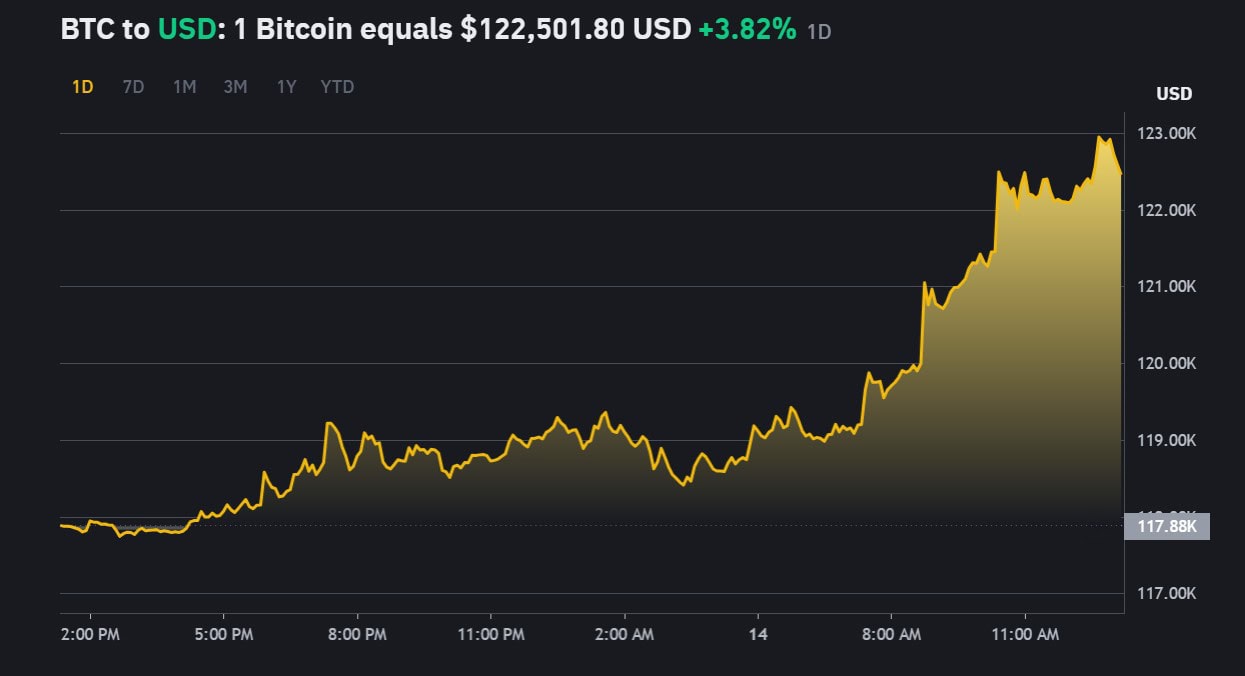 Bitcoin surges past the $120,000 threshold for the first time on July 14, surging to a record peak of $122,571, then settling around $121,952. That’s a daily gain of roughly 2.4 percent, pushing its 2025 gains to nearly 29 percent.