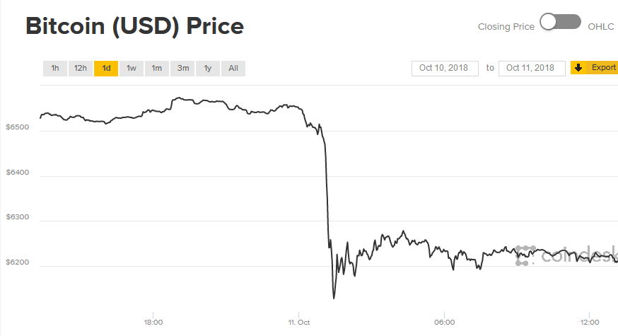 The value of Bitcoin was hovering at about $6,535 before the 30-minute slide started. The value was down by 5.2% to $6,191 within next half an hour. The value of Ethereum, which had been hovering at about $220 was down to $206 and further plunged to $198. Ripple, on the other hand, was down to $0.402.