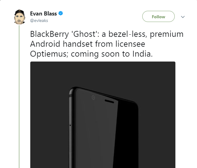 Mobile industry watcher Evan Blass has leaked an image of a smartphone, supposedly “Blackberry Ghost” in a Tweet, which might be launching in India anytime soon.