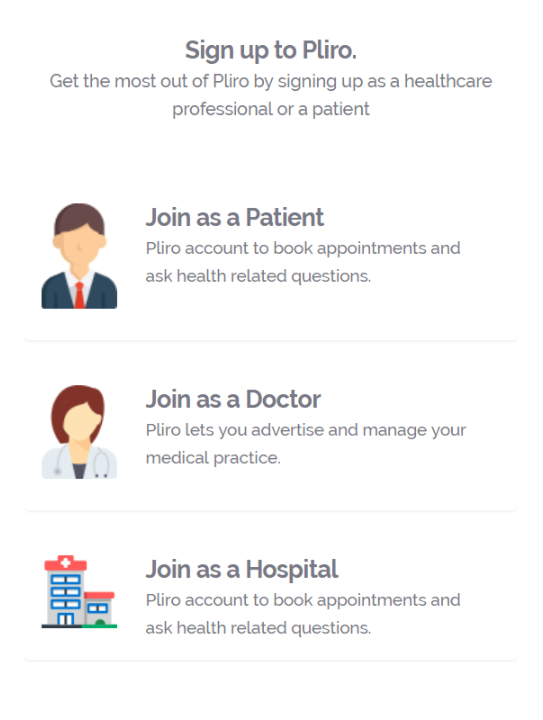 There are three main profile options while signing up; you can sign up as a patient, as a doctor, or even a hospital. For the purpose of this demonstration, we are signing up as a patient.