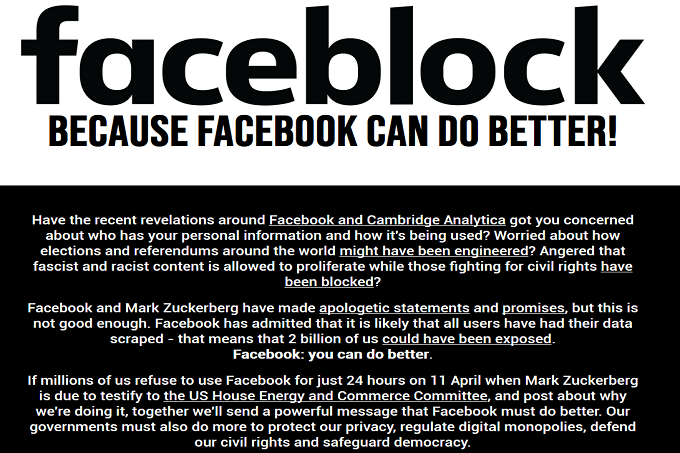 The campaign “Faceblock” has been planned to coincide with Mark Zuckerberg’s speech before US Congress on 11 April, where the CEO will be testifying about the data breach.