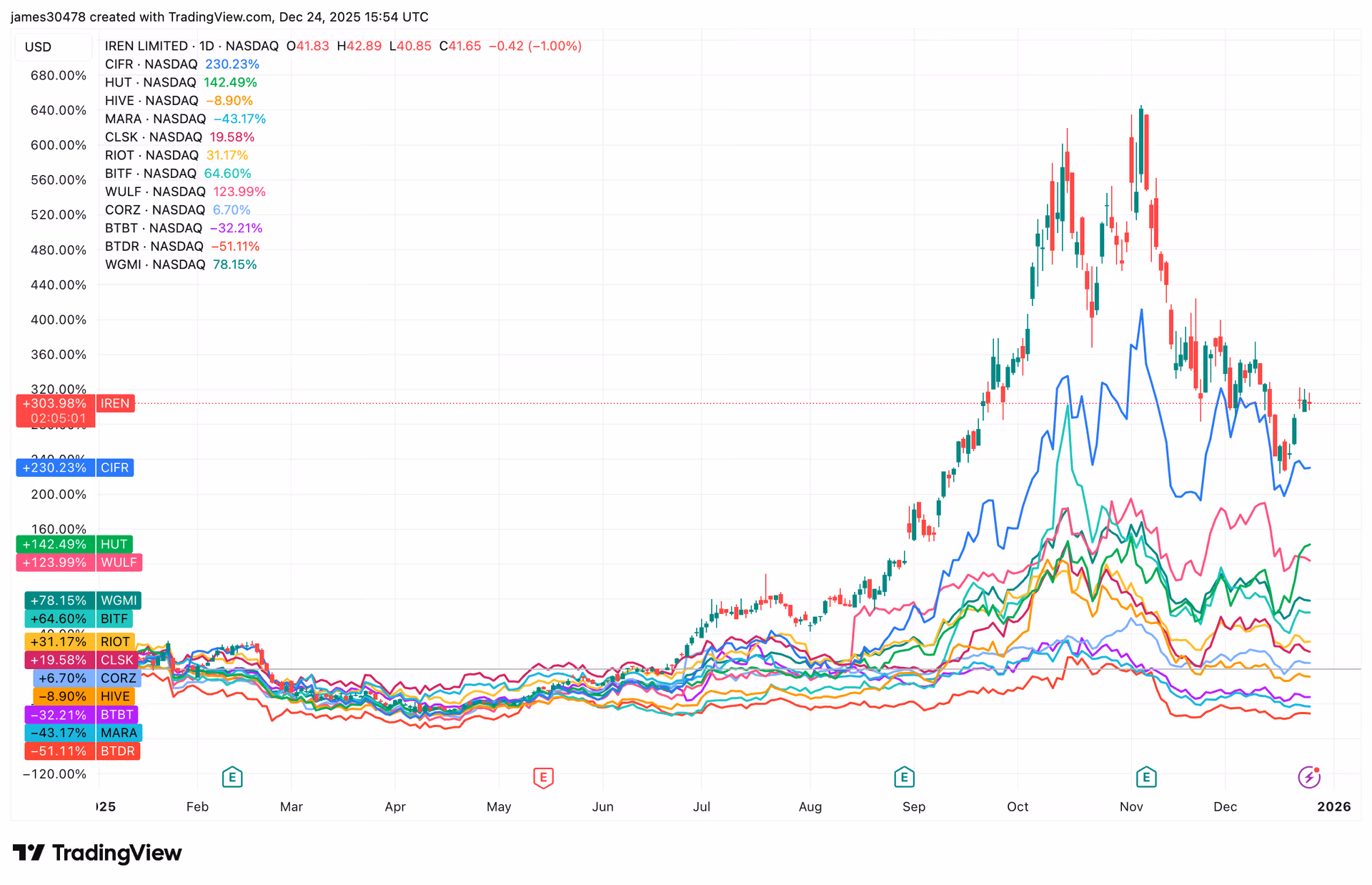 In contrast, bitcoin-focused miners without early diversification struggled. Marathon Digital, despite holding the largest Bitcoin reserves among peers, saw its share price fall roughly 44% YTD, while CleanSpark and Riot Platforms posted modest gains. Bitdeer Technologies was the biggest laggard, with losses of around 50% following disappointing earnings and delays in AI strategy execution.