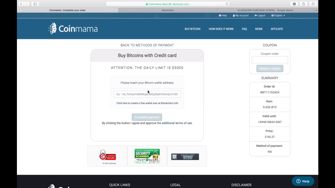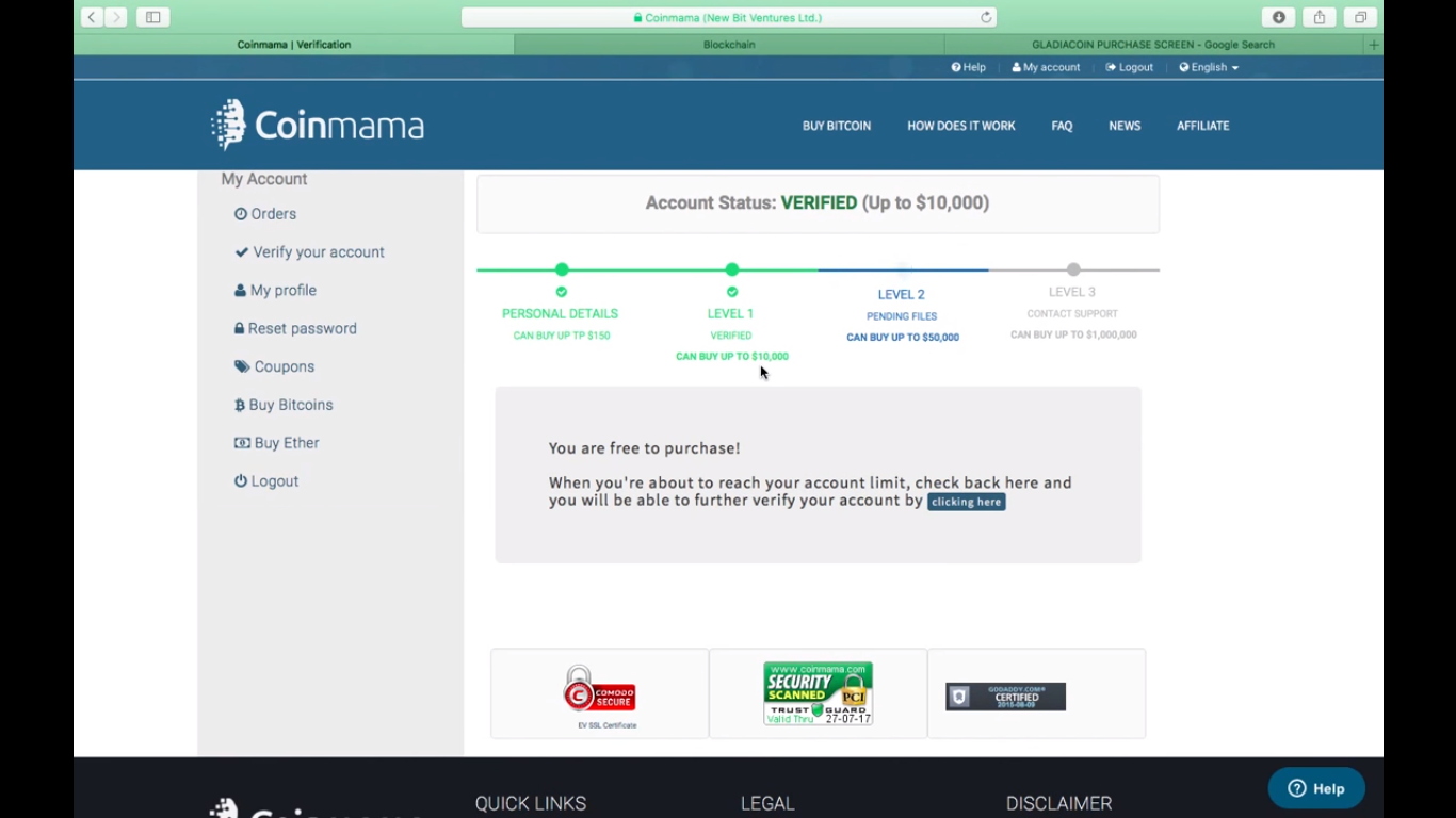 - Verify your account. Unless you verify, you won’t be able to make large transactions on Coinmama. You will need pictures of