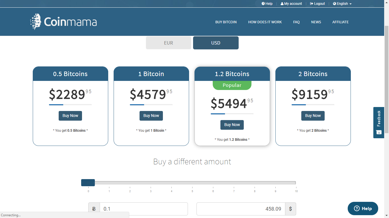 - Go to the Buy Bitcoins select one of the available amounts or use the use “slider” (the price calculator) to buy more or less than the amounts offered. Select the amount and proceed.