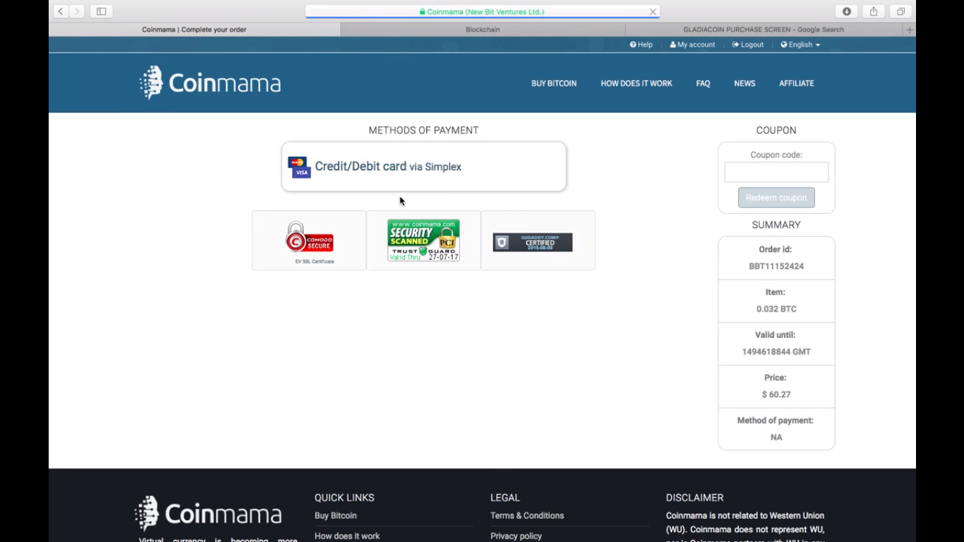 - Select the payment method. At the moment Coinmama offers payment through any Credit or Debit Card only as long as it’s Visa or MasterCard.