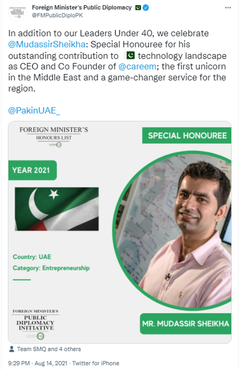 Mudassir Sheikha, CEO & Co-founder of Careem has been conferred with the Special Honouree in the Foreign Minister’s Honours List 2021 for his contribution to Pakistan’s technology landscape for creating the first unicorn in the Middle East. The list is an initiative taken by the Foreign Minister of Pakistan, Shah Mahmood Qureshi to reach out to overseas Pakistanis.