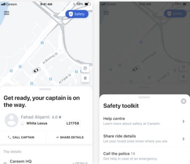 - Safety button – This allows you to access all of Careem’s safety features and enables you to call the law enforcement authorities (LEAs) in case of an emergency.