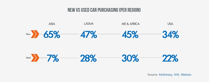 In 2015, the global automotive sales are anticipated to touch 89 million which is a staggering 2.4% growth from the 2014 figure. The growing market share for global sales will increase from 50% in 2012 to 60% by 2020. It will allow shares of global profits to gain a 10% increase. Asia had the highest purchase intent, where 65% stated to buy a new car within two years, as opposed to the 7% audience who intend on buying a used car.