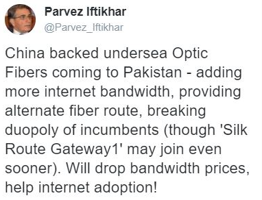 ICT expert Parvez Iftikhar tweeting about the PEACE submarine cable said: