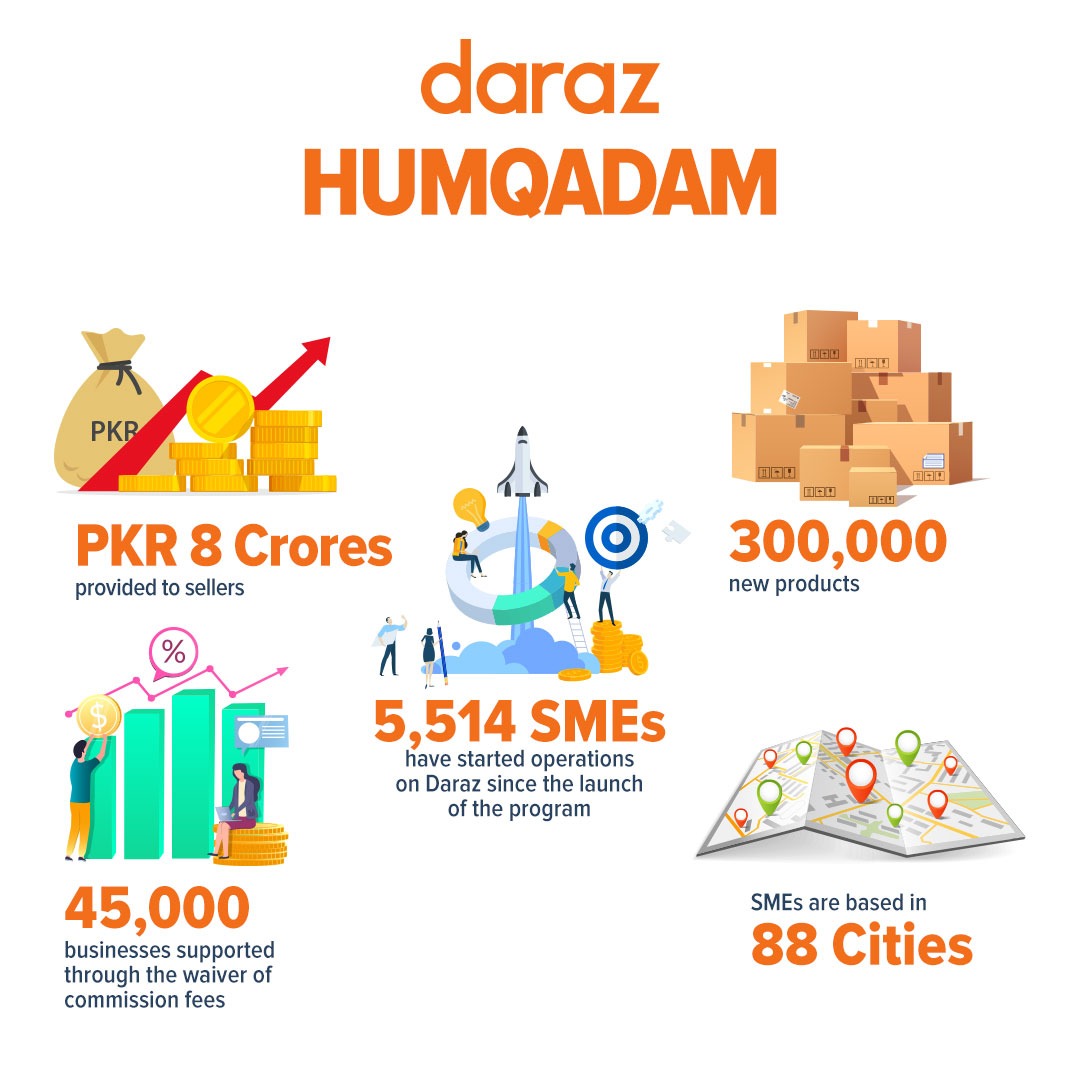 Since the launch of the Daraz Humqadam program in May, which invited SMEs to set up their shops on the leading ecommerce platform to sell online in Pakistan,Daraz has provided business and financial support to 45,000 businesses across the country and enabled 5,514 SMEs to transition towards digital operations by setting up their stores on the platform.