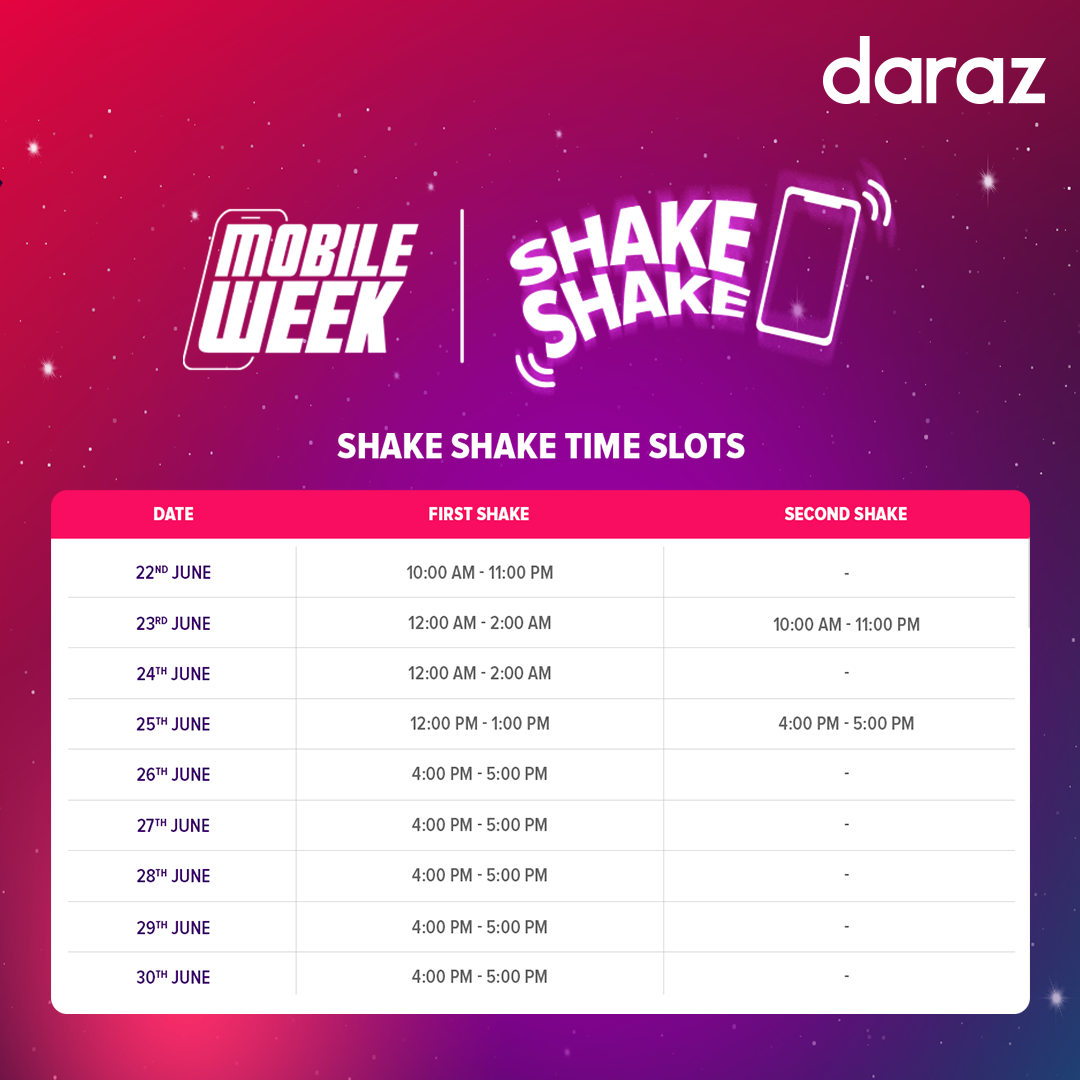During Mobile Week, there will be two 14-hour and 7 1-hour Shake Shake sessions on the Daraz app. Take note of them in the image below and be sure to log onto your Daraz app at the specified times.