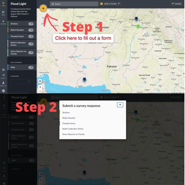 If you also want to take part in helping flood victims and you have authentic info you can add some value to the cause by going to the FloodLight option on the FloodPK.com website. Click on the yellow-orange circle with the + sign, this will open the ‘submit a survey response’ window. Then you have to select a survey response among the listed ones, this will direct you to the information panel, whereby starred categories are essentially required, and the regional latitudes and longitudes can be tracked on Google maps and entered accurately.