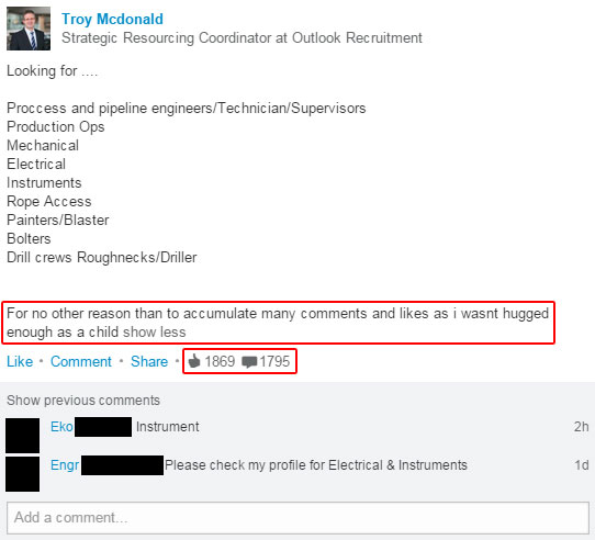 First off, no recruiter in the world has enough time to go through that many applicants, so anyone who sifts through posts to find one like it is simply wasting his/her time. Moreover, where it gets even more serious is that people even give personal information (like phone numbers) in reply to these posts without sparing any thought for consequences. This trend has caught on so much so that some people have taken to mock it by creating a parody of such posts, and behold: people commenting on these parody posts all the same — by thousands, without even reading them completely:
