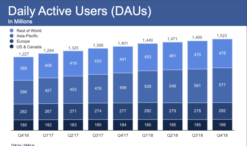 Despite being under scrutiny for spreading fake news, the social media giant reported a rise in monthly active users from 2.27 billion to 2.32 billion. The daily active users also grew from 1.49 billion to 1.52 billion over the last three months of 2018. These numbers are both up from last quarter by 1.8 percent and have aided the revenue hit $16.9 billion in Q4, beating the Wall Street expectations of $16.4.