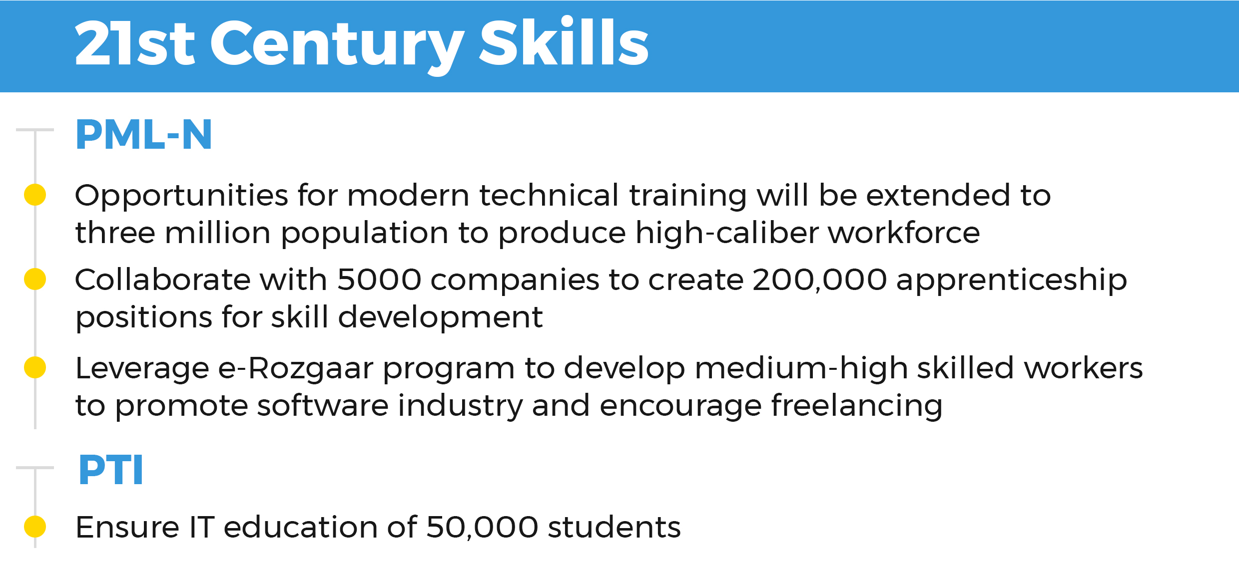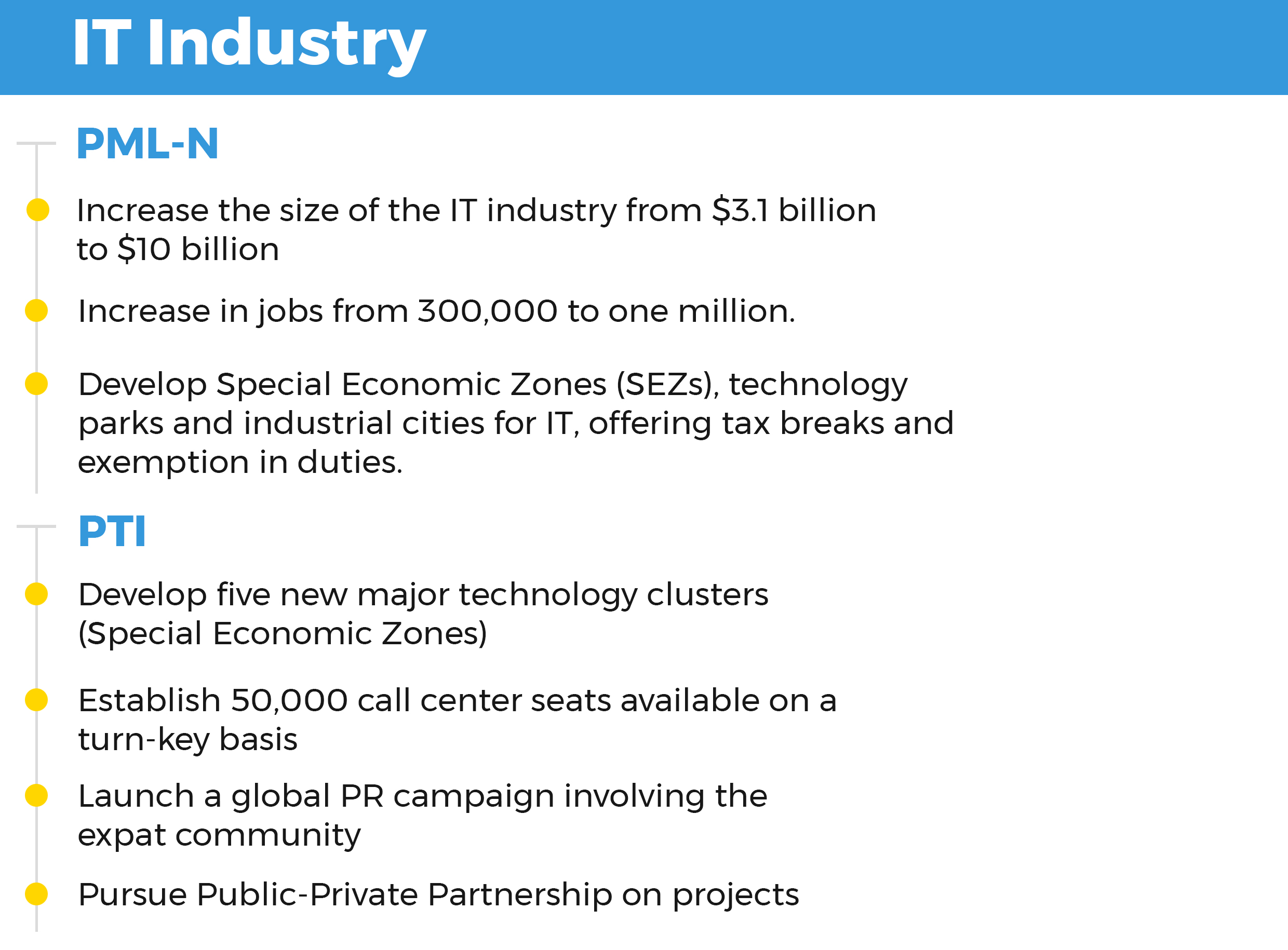 The policy was followed by the manifesto of Pakistan People’s Party (PPP) that contains a three-pronged approach for the advancement of the local IT sector. The approach falls short on chalking out an action plan and revolves around only introducing critical policy statements and regulatory frameworks. Seems to be added as an afterthought, the technology agenda in the PPP manifesto failed to address education-related incentives and e-governance.