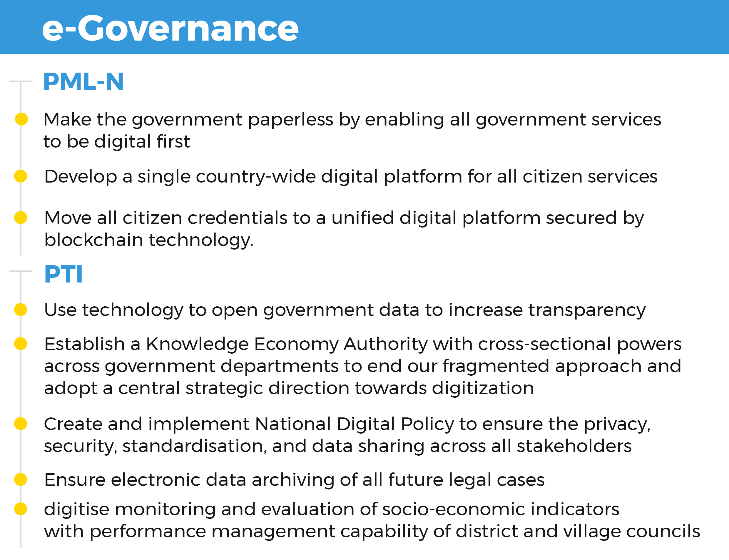 Given the understanding of the technology and entrepreneurial sector that Pakistan Muslim League (PML-N) gained in their past tenure, their manifesto necessarily puts a strong focus on Digitising Pakistan and it does so with an action plan. Major incentives already piloted in Punjab are mentioned to be expanded across the country with a strong focus on digitizing citizen services.