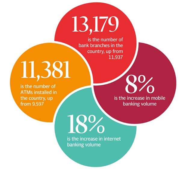 “Payment System infrastructure also showed phenomenal growth during the period under review. The number of branches increased from 11,937 to 13,179 whereas total number of ATMs installed in the country increased from 9,597 to 11,381 during the year.”