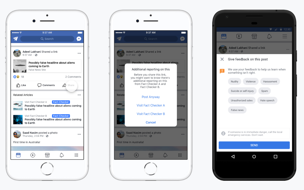 “We also want to empower people to decide for themselves what to read, trust, and share. When third-party fact-checkers write articles about the accuracy of a news story, we show these articles in Related Articles immediately below the story in News Feed. We also send people and Page Admins notifications if they try to share a story or have shared one in the past that’s been determined to be false.
