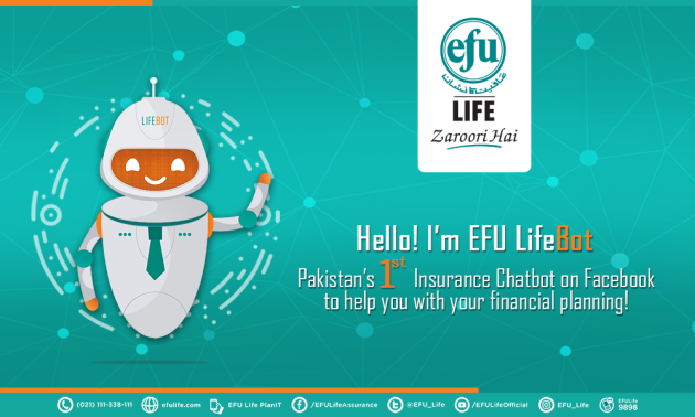 In a first for any Pakistani Insurance company, EFU Life has launched “EFU LifeBot”, a Messenger Chat bot on Facebook designed to guide its growing base of over 2 Million Facebook Fans & Customers regarding insurance services.