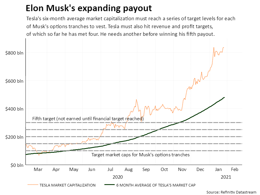 In fact, the company’s market cap has already shot past four of the twelve tranches since February last year on its way to overtaking Facebook the fifth most valuable publicly traded company in the US at $843 billion. According to experts, the company’s closing stock price on Wednesday puts it just over the line to trigger the fifth tranche, meaning Musk could earn a mind-boggling $35 billion dollars.