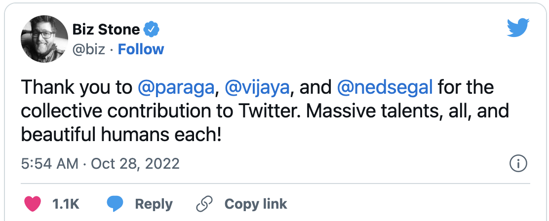 Musk was supposed to have said that he intends to reduce 75% of Twitter’s workers. Still, he later backtracked on that comment — however, gutting four executives on a Thursday night isn’t comforting to the company’s remaining employees. Even Twitter co-founder Biz Stone commented on the upheaval.