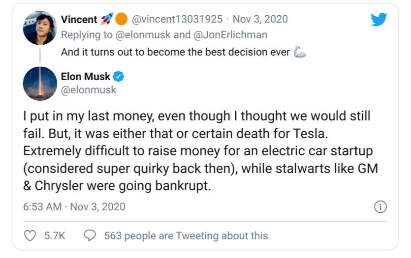 “That was a crazy tough year. Tesla financing closed at 6pm Christmas Eve – last hour of the last day possible. Payroll would otherwise have bounced two days after Christmas,” Musk replied.