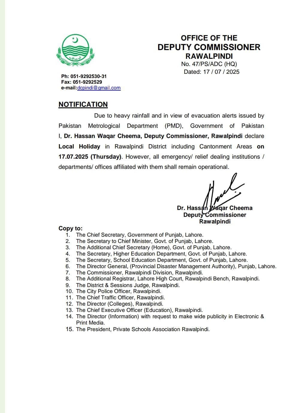 In light of evacuation warnings from the Pakistan Meteorological Department, Deputy Commissioner Dr. Hassan Waqar Cheema has announced that all offices and schools in the district (including cantonment areas) will remain closed, with emergency services staying fully operational.