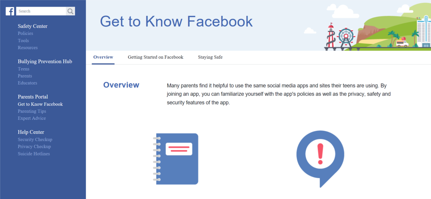 The whole portal resides under the Safety section of Facebook and contains links to many child advocacy groups that focus on shaping and carrying out policies related to children online.
