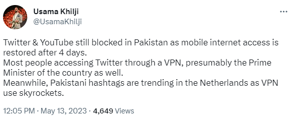 Usman Khilji, Bolo Nhi Director stated that,”most people are accessing Twitter through a VPN,presumably the prime minister of the country as well. Meanwhile, Pakistani hashtags are trending in the Netherlands as VPN use skyrockets”.