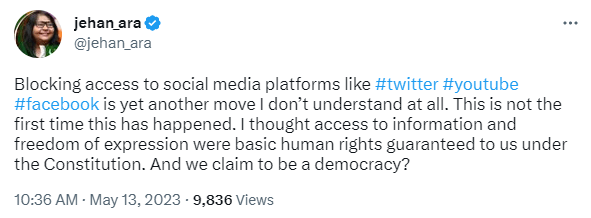 On the other hand,Jehan Ara in her tweet said, “blocking access to social media platforms like Twitter, Facebook and YouTube is yet another move, I don’t understand at all. I though acres to information and freedom of expression were basic human rights guaranteed to as under the Constitution, and we claim to be a democracy? ,She asked”.