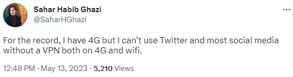 Sahar Habib Ghazi, in her tweet said that, “for the record I have 4G but I can’t use Twitter and most social media without a VPN both on 4G and WiFi”.